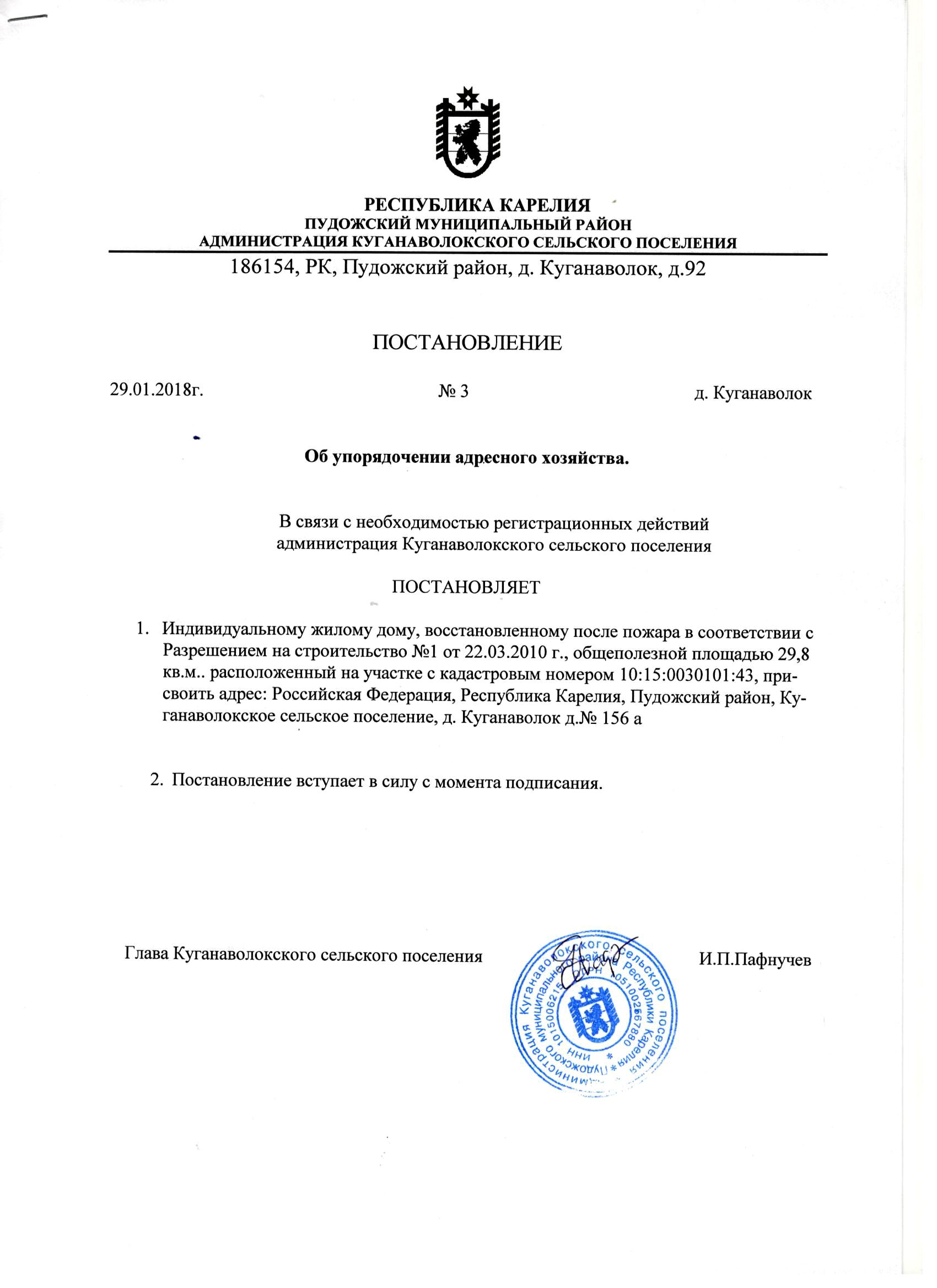 Реестр Постановлений администрации Куганаволокского сельского поселения за январь месяц 2018г.